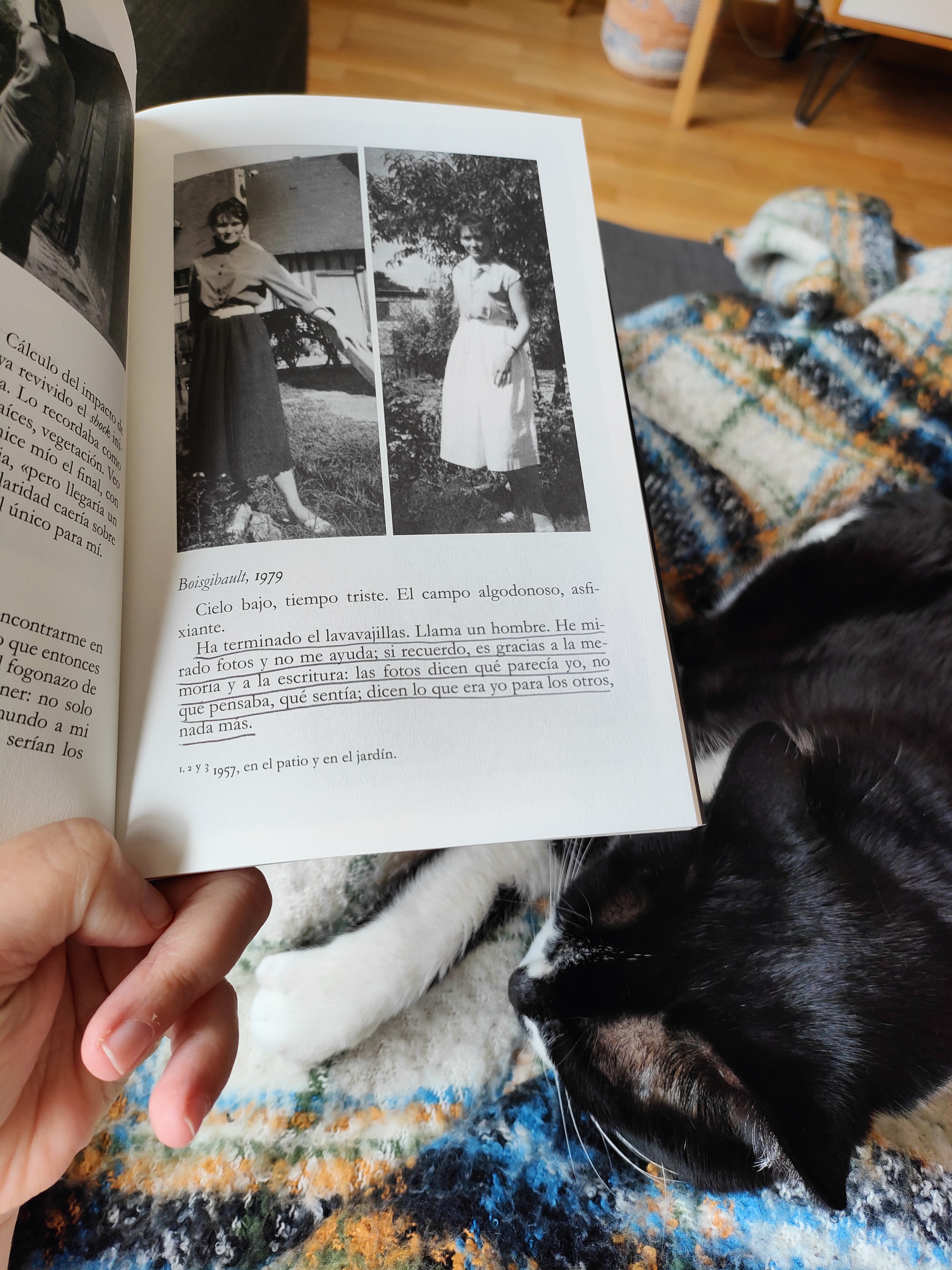 Entonces, con la lectura de este fotodiario no solo me estoy saltando todos los otros libros que estaban aguardando pacientemente su turno en mis estanterías sino que además me estoy saltando en particular el orden que acordé con Annie Ernaux —sin que ella lo sepa o le importe — en el que la iba a leer: por la fecha en la que publicó sus libros. Así es que había empezado el año pasado (o ¿hace dos?) con Los armarios vacíos y ahora interrumpo mi propio acuerdo con Escribir la vida, cuando me esperaba antes Lo que ellos dicen o nada. En este punto me parece importante asegurar que estos comportamientos míos no me generan mortificación ninguna y los condono siempre en base a la preservación de esta actividad que me ha dado tanto; leer.
