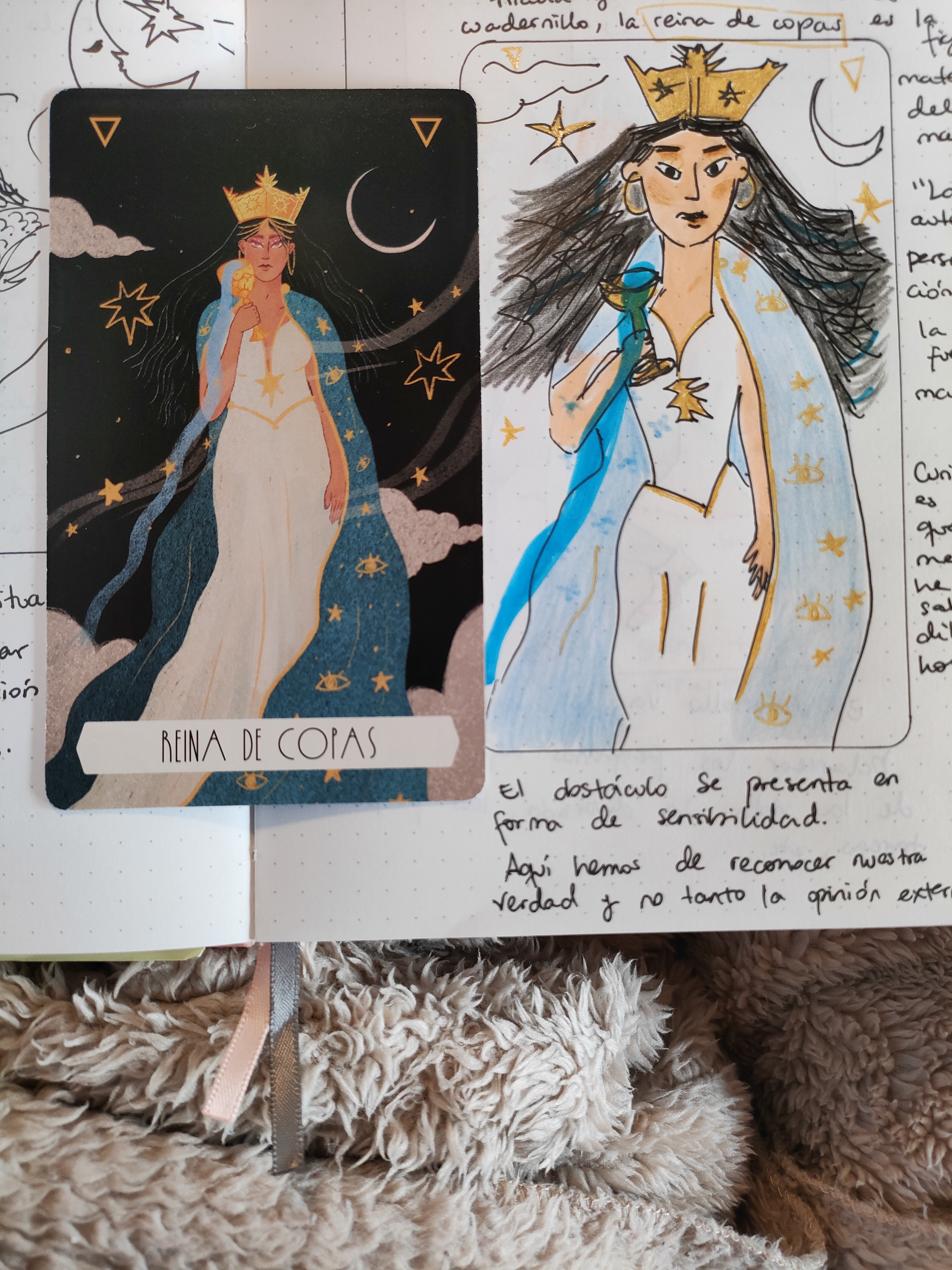 El día que saltó la reina de copas, antes de tirar las tres cartas pensé en pedir a mi mamá, que ya no vive, una ayuda para ver más claro lo que me hiciese falta ver. Y resulta que esta carta es la figura maternal del mazo. «La auténtica personificación de la fuerza maternal.»