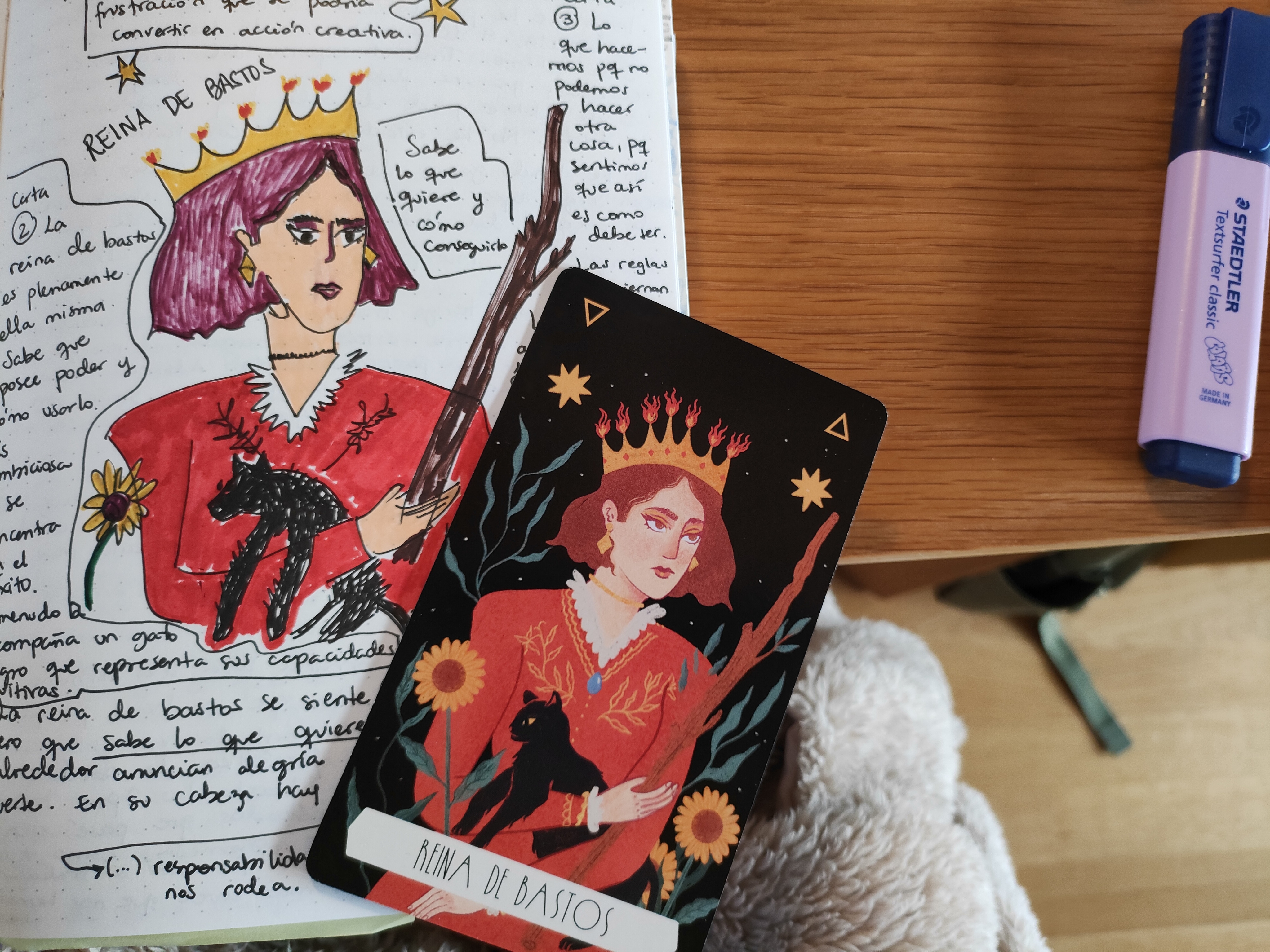 Es sólo gracias al taller de cuaderneo de que ahora uso las cartas de tarot para escribir, para intuir en compañía o para dibujar. Me permito ser una principiante de por vida con este asunto; no saber nada de tarot y haberme comprado una baraja puramente por su aspecto, intentar replicar el dibujo de la carta que más me guste en el cuaderno, escribir lo que yo creo que dice antes de leer el librillo de trampitas.